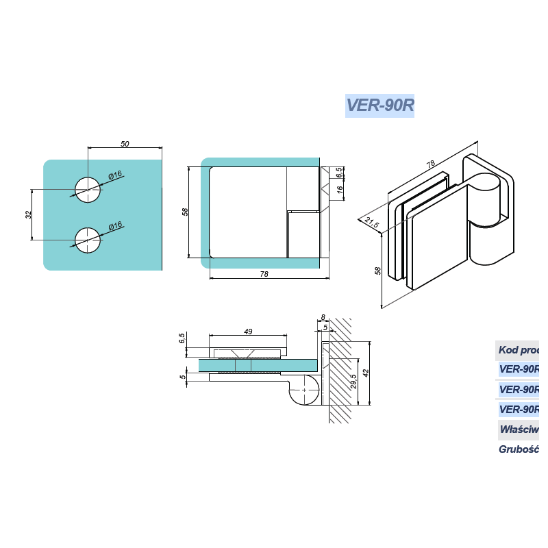 A sturdy, precisely manufactured hinge designed for installing glass doors in shower enclosure structures, connecting the glass to the wall element at a 90° angle. Equipped with a door lifting mechanism when opening, which ensures smooth movement, minimises seal wear and facilitates closing.