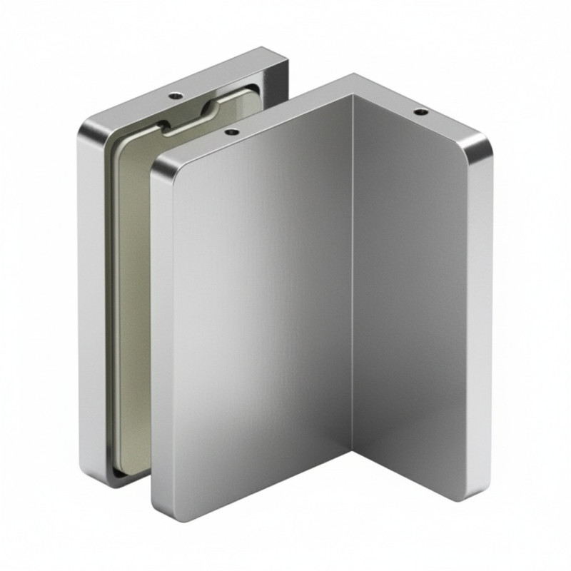 The VER-SLIM-901 connector is a robust and aesthetically pleasing mounting element designed to connect glass panes to the wall at a 90° angle in shower enclosures. Made from high quality materials, it ensures durability, resistance to moisture and an elegant appearance.