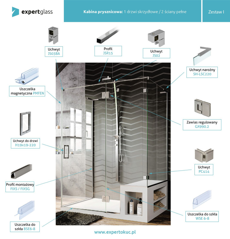 Zestaw dopasowany jest to kabiny prysznicowej typu: jedne drzwi uchylne i dwie ścianki stałe.
