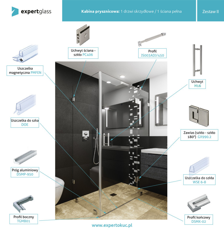 Zestaw BOLOGNA to kompletny pakiet okuć i akcesoriów niezbędnych do montażu eleganckiej kabiny prysznicowej ze szkła. Starannie dobrane elementy wykonane są z wysokiej jakości materiałów, co gwarantuje trwałość, bezpieczeństwo oraz estetyczny wygląd całej konstrukcji.