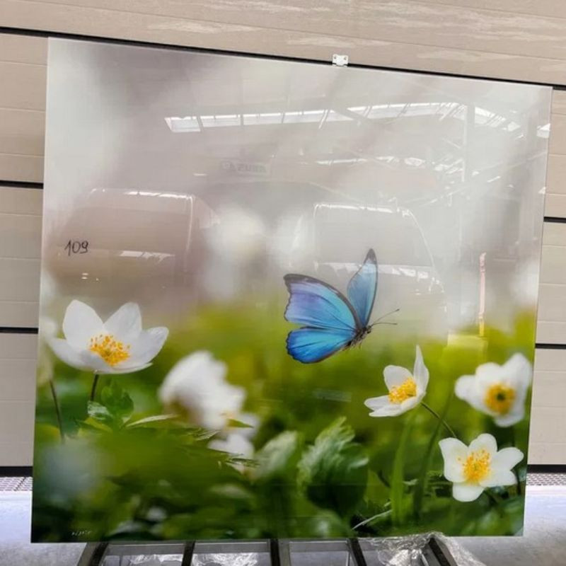Na predaj ponúkame 6 mm tvrdené sklo Optiwhite s dekoratívnou grafikou motýľa - ideálne ako originálny interiérový doplnok. Tabuľa má leštené, brúsené hrany, nie sú na nej žiadne značky kalenia a jej stav je bezchybný - bez poškodenia. Skvelý ako nástenný panel alebo dekoratívna grafika do moderných aj klasických interiérov.