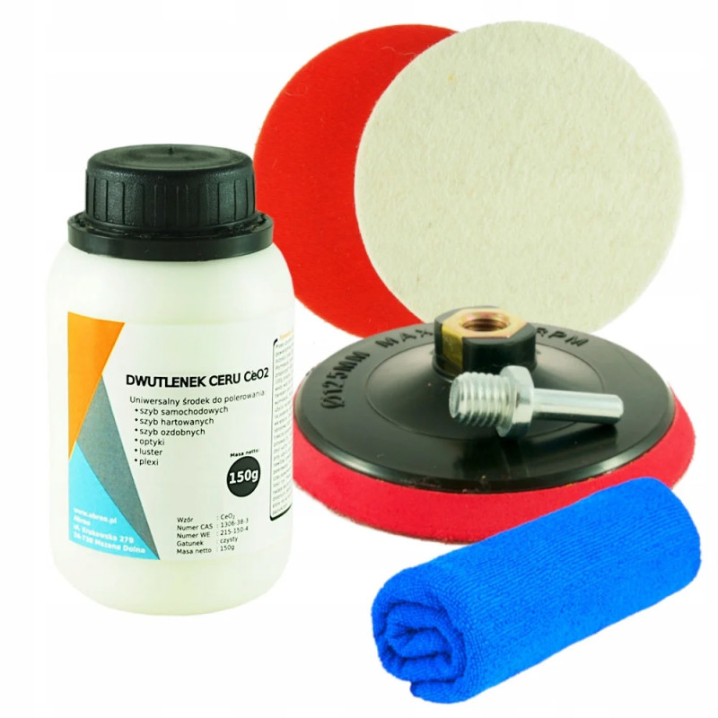 Zestaw przeznaczony do samodzielnego polerowania i odświeżania powierzchni szklanych. Idealny dla osób zajmujących się autodetailingiem, pracami renowacyjnymi oraz majsterkowaniem. Umożliwia skuteczne usunięcie drobnych rys, zmatowień i osadów z szyb samochodowych oraz wielu innych elementów szklanych.