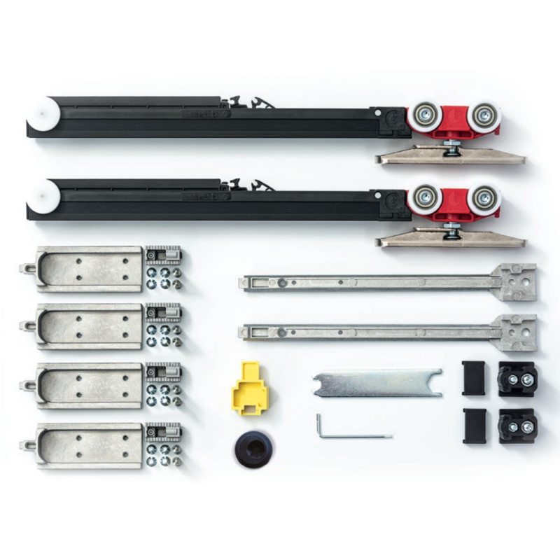 Profesjonalny komplet okuć przeznaczony do montażu drzwi przesuwnych, wyposażony w podwójny amortyzator typu FLUID DAMPER zapewniający płynne i ciche domykanie skrzydła.